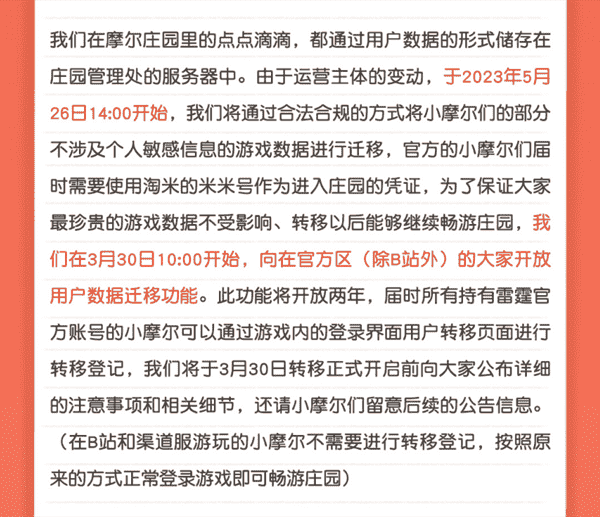 合作结束本就是开发方和代理方双方的事情,,,,降低这件事情对玩家的影响,,,才是对所有珍视这段童年的摩尔玩家最好的呵护。。。。目前看来,,,用户完全不用担心后续因无法登录游戏而造成任何数据上的损失,,只要及时进行账号转移,,就可以好好保留、、、、延续在庄园的痕迹和回忆,,,,继续在庄园里做快乐的红鼻子小鼹鼠。。。。