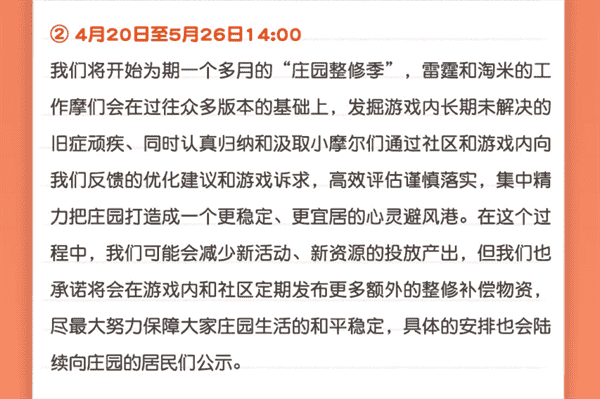 合作的结束并不意味着这个童年IP的结束,,,对于《摩尔庄园》手游而言,,这是一个新阶段的开始。。。后续游戏内将开启庄园重构计划,,会就以往遗留下来的BUG进行集中修复,,,并在游戏内和社区定期发布更多补偿物资。。