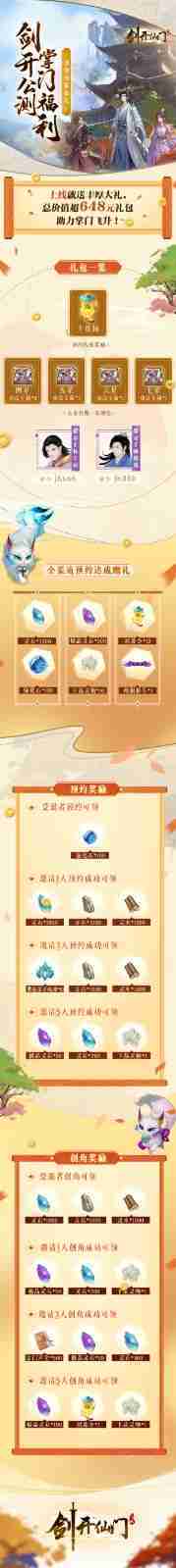 游戏为大家准备了海量的福利,,,,包括上线即可获得的全渠道预约礼包、、、十连抽等福利,,,输入密令“JK666”、、、、“JK888”即可领取紫色弟子,,,,达到金丹期后还有功法宝箱可领,,助力全宗上下实力提升……所有奖励总价值超过648元,,,,而邀请好友一起体验,,,,更可以获得额外的奖励哦~