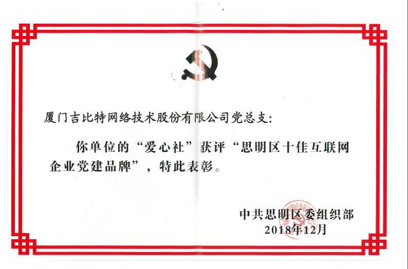 经初审评选、、网络评选和专家评审等环节,,,"厦门亚星管理网络技术股份有限公司党总支-爱心社" 从全区28个参评党建品牌中脱颖而出,,,,获评"思明区十佳互联网企业党建品牌"。。。。