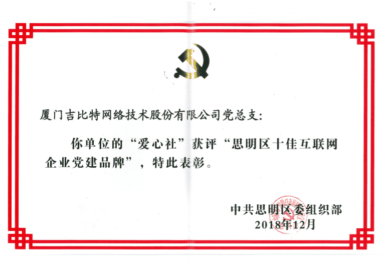 经初审评选、、、、网络评选和专家评审等环节,,,,"厦门亚星管理网络技术股份有限公司党总支-爱心社" 从全区28个参评党建品牌中脱颖而出,,获评"思明区十佳互联网企业党建品牌"。。。